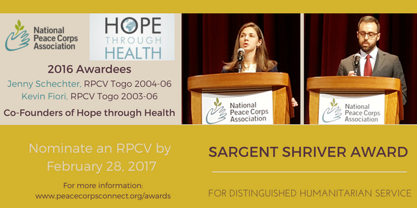 Do you know an RPCV who continues to make a sustained and distinguished contribution to humanitarian causes at home or abroad? What about an RPCV who is an innovative social entrepreneur who will bring about significant long-term change? Nominate him or her for the Sargent Shriver Award for Distinguished Humanitarian Service. Deadline: February 28, 2017.