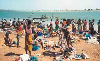 I continue downstream to Nafadji, and complete the journey to Bamako by bus – 22 adults plus a fewchildren in a regular Hiace van. Being wedged in tightly means less rattling on the bumpy road. A pane-less window ensures good ventilation, and being stuck with my head against the ceiling, above window level, means slightly less dust. The roof rack is piled high with sacks, tin trunks and a miserable looking sheep. The 130 km trip takes six hours – I am the dirtiest and most uncomfortable I had been for weeks, yet strangely happy, buoyed by the bond of shared suffering.