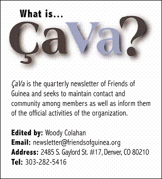 A. Ramshur (Koubia, �00��02) On jaraama! My name is Emily Ramshur and I am an RPCV from Koubia, 2000-2002. I am pleased to have recently joined Friends of Guinea as Director of Membership. We currently have 216 members, including both Americans and Guineans.� I would like to take a moment to encourage COSing volunteers to JOIN our membership community. The organization can help to bridge your experiences in Guinea and the US. PLUS, as a "fresh off the boat" RPCV, your membership is free! Furthermore, if each COSing volunteer could encourage 1 or 2 friends or family members to do the same (their membership would be only $15), we could really grow our ranks and offer even more support to projects in Guinea! Please join FOG and encourage others to do so � it feels great to be part of a network of people who love and want to support la belle Guin�e! Brian Farenell (Beindou, �95��97) I am pleased to announce the launch of Friends of Guinea's new blog. The blog will be used primarily to publish news stories from and about Guinea derived from various sources around the Internet. It will contain internal news about FOG and from FOG members as well as information from the National Peace Corps Association and the Peace Corps itself. We may also publish short fiction and non-fiction writing as well. Basically, we will post anything that might be of interest to FOG members. Please check it out at: www.friendsofguinea.blogspot.com. Please contact me at communications @ friendsofguinea.org if you have any comments, suggestions or ideas. Sharon